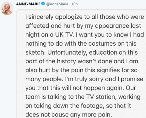 앤 마리는 깊은 유감을 표하면서 트위터에 담백한 글을 올리며 "어제 밤 영국 TV 쇼에 출연한 것에 대해 영향을 받고 상처를 입은 모두에게 진심으로 사과드립니다."라고 말했습니다. 그녀는 자신의 행동이 일으킨 고통을 인정하며, 이러한 사건이 다시 발생하지 않도록 약속했습니다.